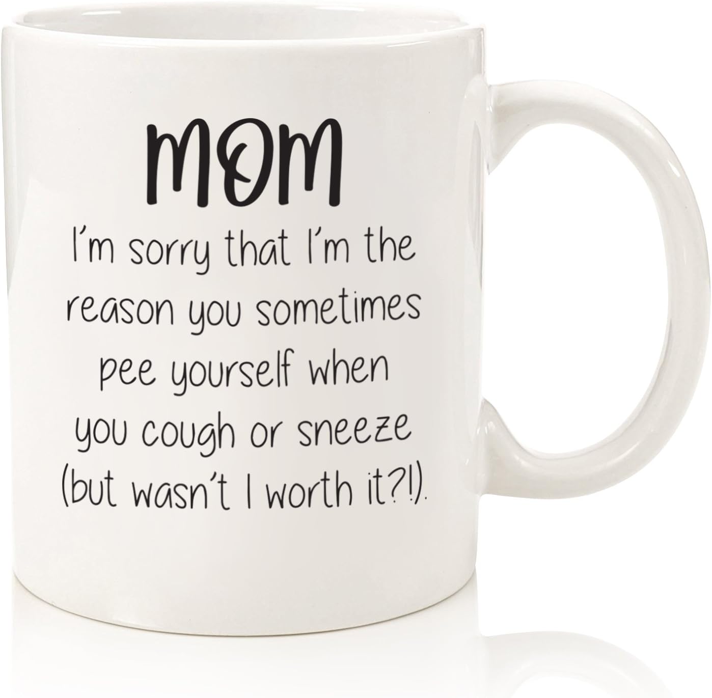 - THE PERFECT GIFT FOR A MOM - a hilarious present for a mom from her child; the design says “Mom, I’m sorry that I’m the reason you sometimes p_e yourself when you cough or sneeze (but wasn’t I worth it?!)”